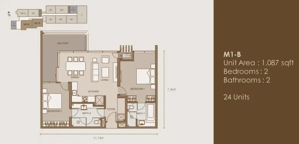 Type M1: 1,001 - 1,087 sq ft (2 Bedrooms, 2 Baths)